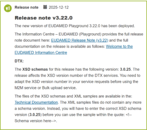 EUDAMED Playground(テスト)サイトは、2025年12月12日のメンテナンス作業により、v3.22.0 が公開されました。今回の更新により、XSD(XMLスキーマ定義)のバージョンが、3.0.25となりました。DTX送信、BulkアップロードのXMLファイルは、3.0.25に変更していないと、EUDAMEDからエラーが返ってきます。リリースノートは、こちらから確認できます。